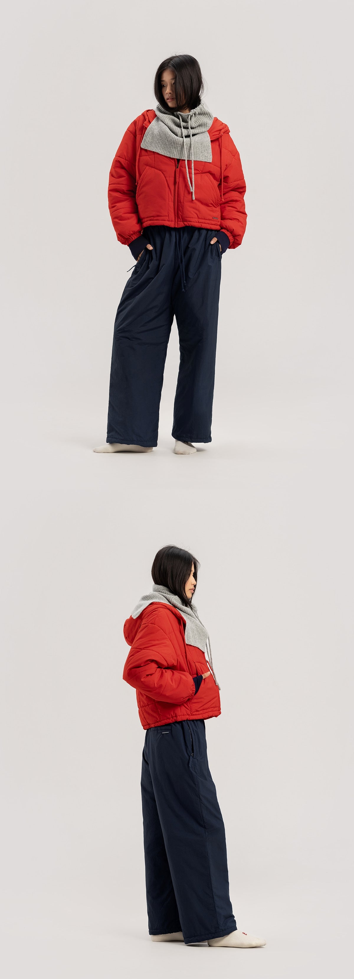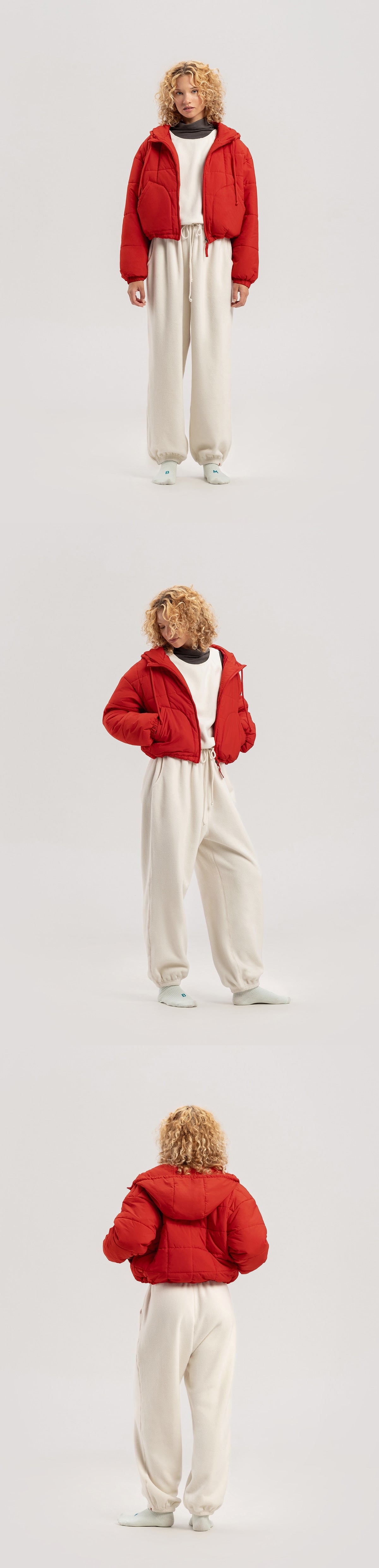 - Cropped-length hooded zip-up padded jacket