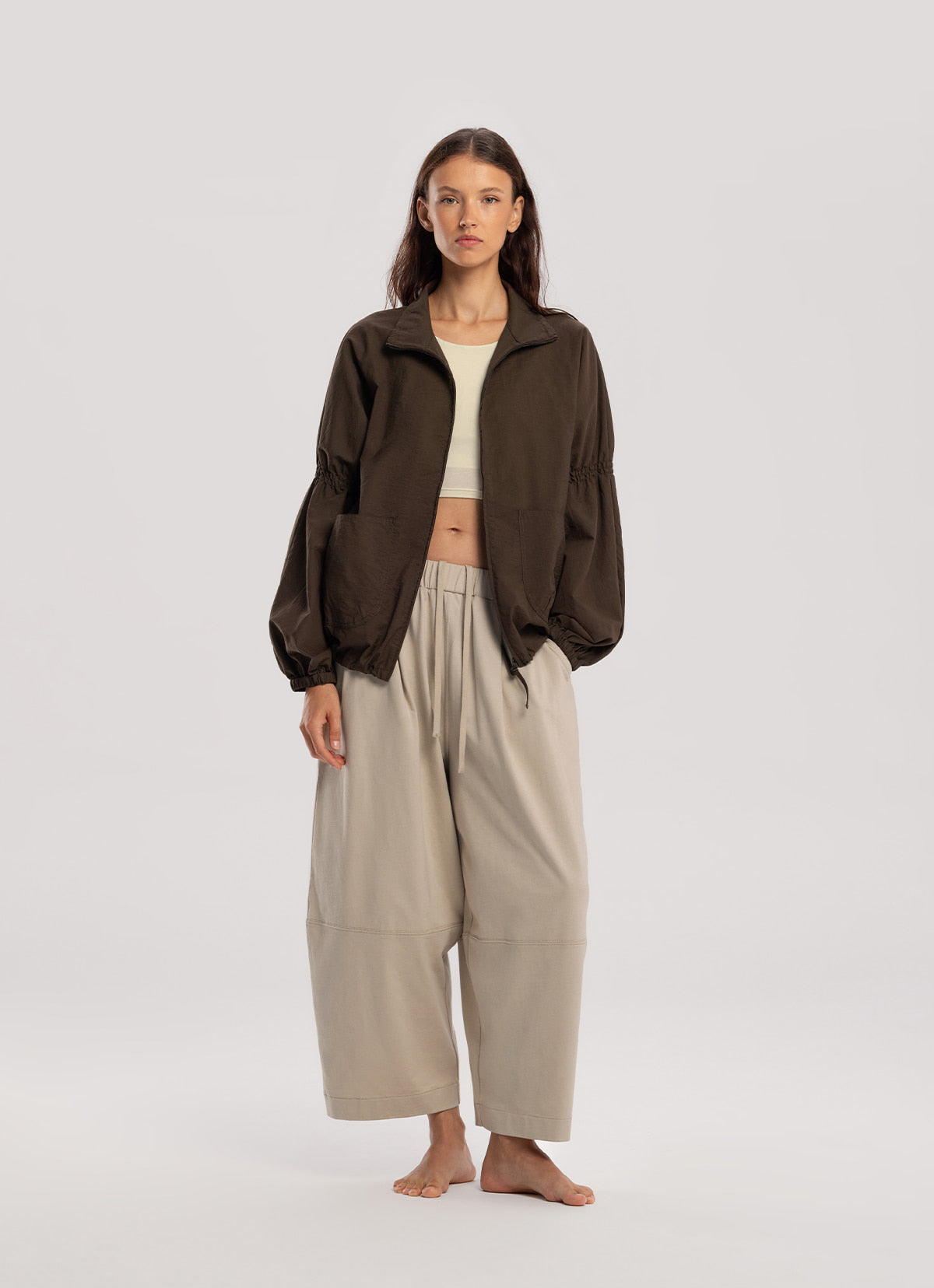 - Adjustable fit with waistband and drawstring details